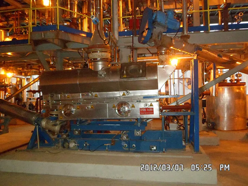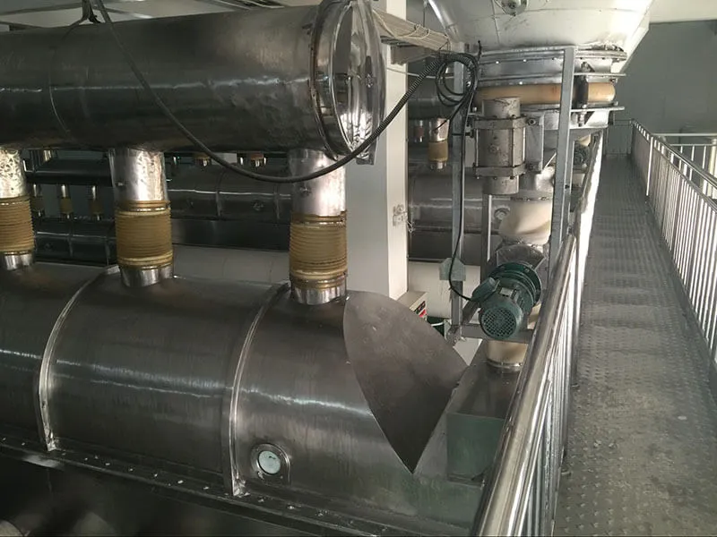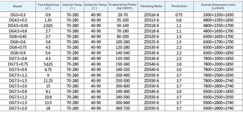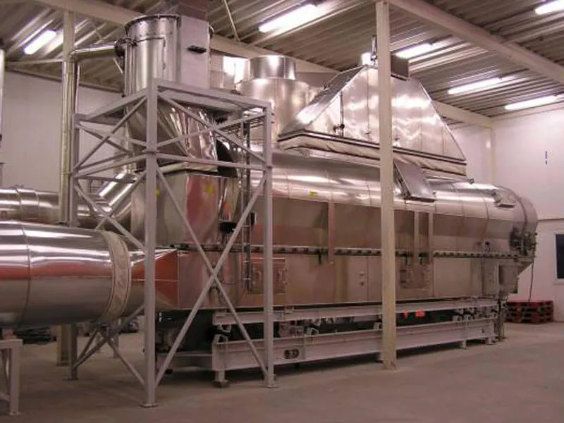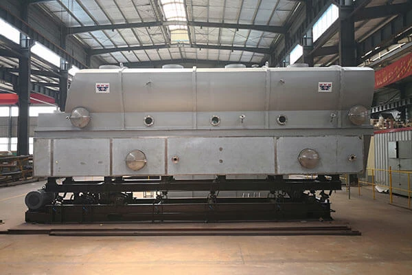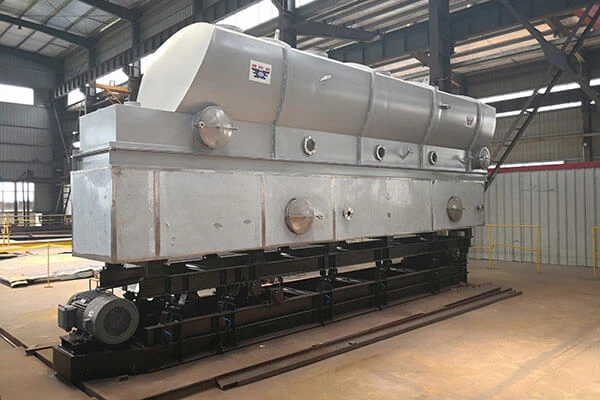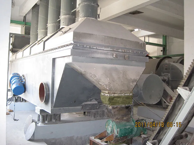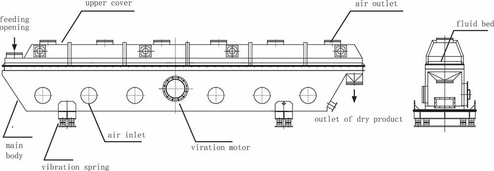 Material from the feeder into the dryer, under the action of the exciting force and bottom-up, hot air under thejoint action of fluidized bed,material along the horizontal direction will move forward continuously, the hot airpasses through the fluidized bed sieve plate heat and mass transfer process, to achieve the puroose of drvinacan be divided into two segments according to the drying production needs, the first half ofpart with hot air todry, the latter part of the material with high temperatureair cooling, packaging reguirements. Wet air through theprecipctator dust as the exhaust gas removal.dry material from the discharge port.