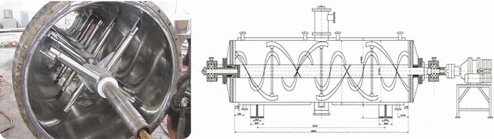 The material is fed into the dryer through the top inlet of the chamber. Under the continuous agitation of the rotating harrow blades, the material moves back and forth axially, while the surface in contact with the inner wall of the shell is constantly renewed. Heat is transferred indirectly through steam within the jacket, and the uniform mixing of the harrow blades, combined with the crushing action of the grinding rods, accelerates moisture evaporation from the material. Under the vacuum system, the vaporized moisture is drawn out, passing through a dust collector and condenser before being discharged via the vacuum pump outlet.
